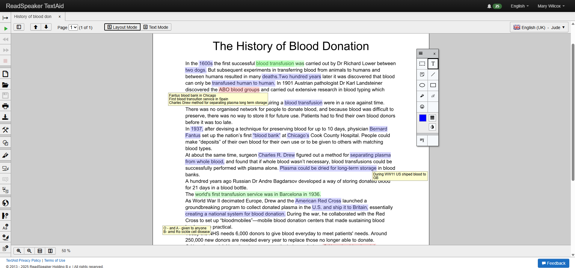 Rather than click play and listen, the annotations button offers post-it style notes, free text, shapes, emojis and lines to add so that users are thinking about what they are listening to. If annotating while listening is too cognitively challenging, the highlighter tool is simple to use. Important parts of the text can be highlighted and then extracted to make a summary. This not only keeps the user engaged with the text but also provides a summary to read, saving time and reinforcing learning.